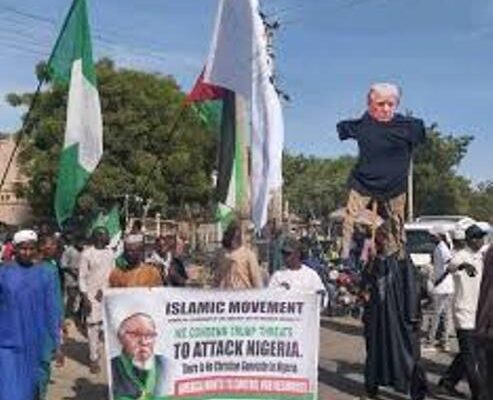LAGOS NOVEMBER 11TH (NEWSRNAGERS)-Members of an Islamic movement group in Kano State staged a protest on Saturday to condemn statements by U.S. President Donald Trump, who recently claimed that Christians in Nigeria are being subjected to genocide and warned of possible military intervention. The protesters wielded placards with messages such as “We condemn Trump’s threat…